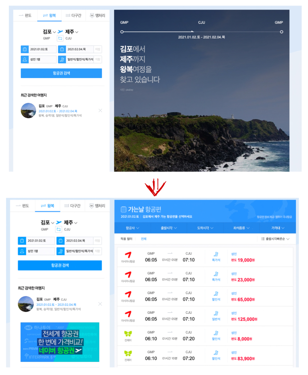 ex) 비행기항공권(네이버 or 스카이스캐너 등등)