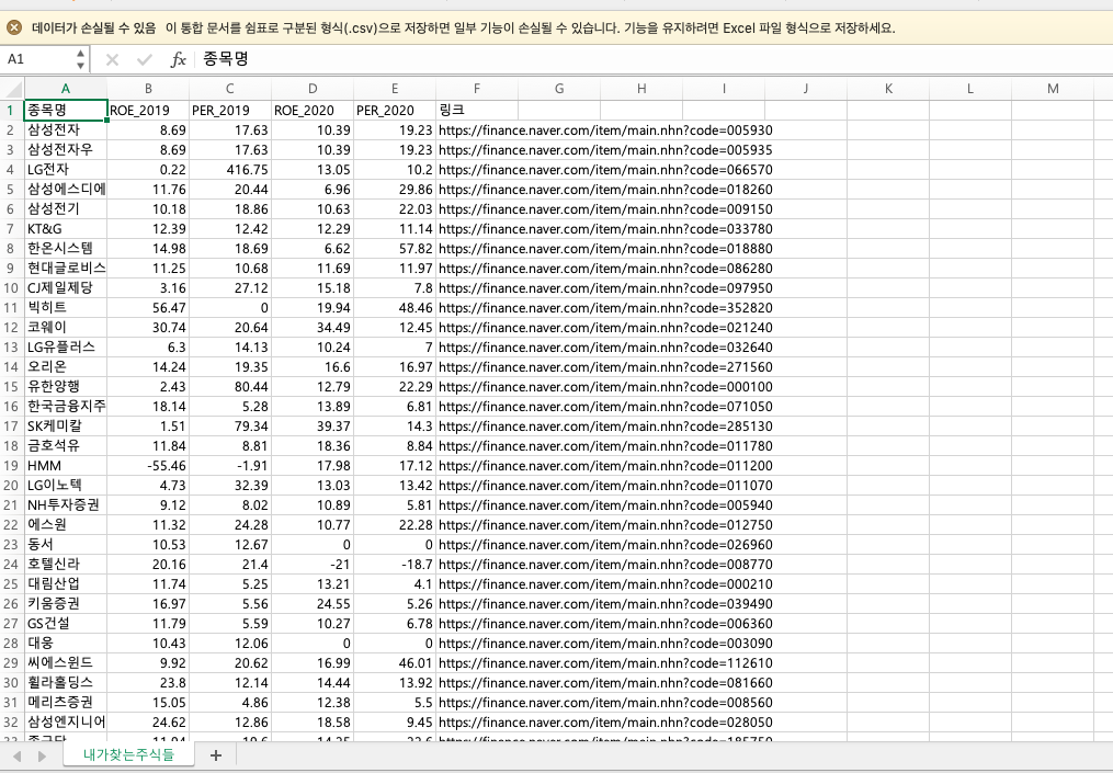 title = ["종목명","ROE_2019","PER_2019","ROE_2020","PER_2020","링크"]