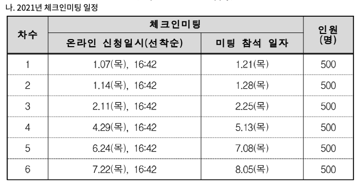 각각 1,2,3차 체크인 미팅 온라인 신청에서 선착순 500명씩 모집을 하고, 이 신청에 성공한 사람들은 체크인 미팅을 갈 수 있다.