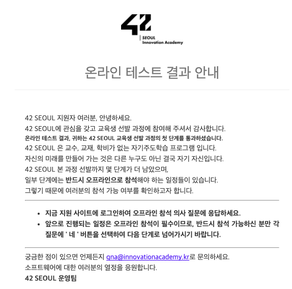 며칠 주 전에(?) 42 서울 1차 온라인 테스트를 봤는데, 1차 온라인 테스트 후기와 그 이후의 과정에 대해 이야기 해보려고 한다.